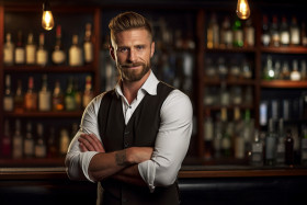 Assured bar manager oversees operations against a blurred background