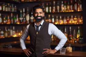 restaurant models bar manager bartender professional confident indian man workplace portrait business success leadership expertise service industry beverage alcohol cocktail restaurant nightlife entertainment blur background focus selectiveImagine Buddy