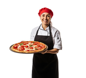 restaurant model chef woman pizza cooking cuisine culinary food preparation uniform apron isolated white background professional occupation career culinary arts italian food dough tossing kneading baking ingredients mozzarella tomato basil fresh delicious meal lunch dinnerImagine Buddy