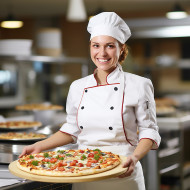 restaurant madel chef pizza woman kitchen cooking food bakery pizzeria dough preparation happy friendly smiling professional skilled occupation workplace blurred background out of focus bokeh culinary hospitality service industry chef's hat uniform apron flour ingredients mozzarella tomato basilImagine Buddy
