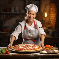 restaurant madel chef pizza woman kitchen cooking food bakery pizzeria dough preparation happy friendly smiling professional skilled occupation workplace blurred background out of focus bokeh culinary hospitality service industry chef's hat uniform apron flour ingredients mozzarella tomato basilImagine Buddy