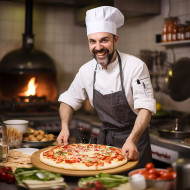 restaurant madel chef pizza food restaurant kitchen cooking man worker professional happy smiling friendly portrait occupation indoors blurred background bokeh preparation service hospitality culinary expertise skill dedication passion enjoyment workplace pizzeria italian cuisine dough tossing ingredients bakingImagine Buddy