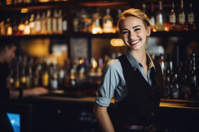 restaurant madel service bartender mixologist beverage cocktail bartending woman female portrait professional occupation workplace restaurant bar pub cheerful friendly smiling happy confident blurred backgroundImagine Buddy
