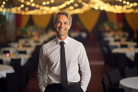 Cheerful banquet manager with a welcoming smile on blurred background