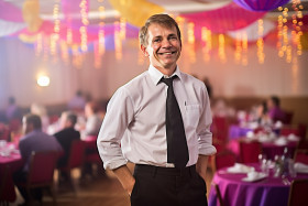 Cheerful banquet manager with a welcoming smile on blurred background