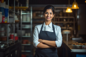restaurant madel food service industry professional woman female indian ethnicity portrait smile friendly happy confident leadership success career workplace business blurred backgroundImagine Buddy
