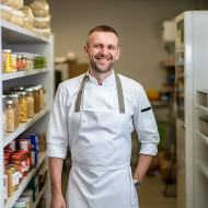 Cheerful chef overseeing kitchen operations against a blurred background