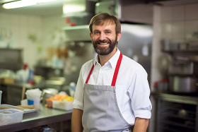 Cheerful chef overseeing kitchen operations against a blurred background