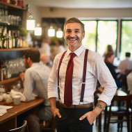 Approachable restaurant manager cheerfully working against a blurred background