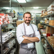 restaurant madel food service manager kitchen cooking professional staff portrait occupation career workplace business uniform apron cheerful friendly happy smiling confident success leadership teamwork blurred background indoor portrait man adult personImagine Buddy