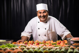Happy indian sushi chef preparing fresh sushi rolls on blurred background