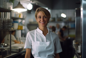 restaurant madel food service professional manager woman chef cook kitchen staff uniform apron portrait headshot smiling friendly confident happy cheerful positive success leadership teamwork blurred background bokeh workplace indoors occupation careerImagine Buddy
