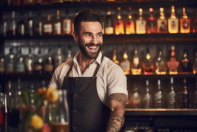 restaurant madel bartender barman mixologist hospitality service beverage alcohol cocktail drink customer smile friendly happy cheerful professional occupation job man male person human blurred background bar pub restaurant nightlife entertainment leisure lifestyleImagine Buddy