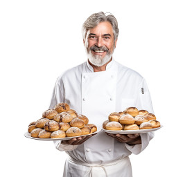 restaurant model chef pastry baker man male adult professional cook kitchen food dessert bakery restaurant uniform hat apron smile friendly happy cheerful confident skilled expert isolated white background studio portrait occupation career vocation culinary artisanImagine Buddy