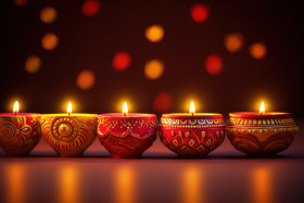 Diya candles glowing in a row against a creative backdrop