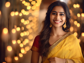 Indian woman in traditional yellow saree exudes joy with a warm smile