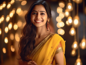 Indian woman in traditional yellow saree exudes joy with a warm smile