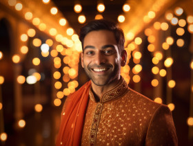 indian groom wedding lights smile happy joy celebration love tradition culture ceremony festive colorful vibrant beautiful handsome ethnic attire turban garlands marigold flowers mandap stage decorationImagine Buddy