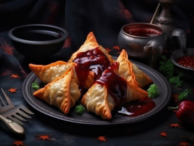 samosa cheese ketchup indian food snack appetizer savory flaky crispy golden brown triangle filling vegetarian spices herbs delicious flavorful popular street food tradition culture cuisine aroma texture indulgence hot spicy cheesy tangyImagine Buddy
