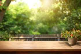 wooden table lush background nature outdoor garden patio greenery foliage plants trees sunlight summer spring vibrant peaceful serene tranquil relaxing calm inviting inspirational creative rustic natural organic eco-friendly sustainable healthy fresh beautiful scenic idyllic picturesque breathtaking stunning mesmerizing enchanting captivating product backgroundImagine Buddy
