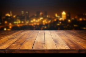 An empty wooden counter top over blurred light background