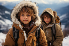 winter hike boys adventure exploration snow mountains cold landscape nature outdoors exploration discovery travel trek journey scenic breathtaking snowy chilly layers warm jackets hats gloves boots friends companionship hyperrealistic hdImagine Buddy