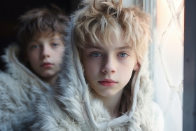 boys children kids pajamas cozy winter frosty window hands cold chill snow indoors warmth bonding family siblings childhood curiosity wonder playful home comfort seasonal temperature atmosphere friendship joy laughter connection snug soft relaxation holiday together indoors serene peaceful love affection curiosity discovery hyperrealistic hdImagine Buddy