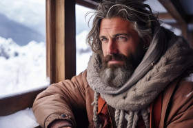 winter coziness man blanket hot drink snow-covered cabin porch relaxation comfort warmth cold snowy landscape holiday season solitude peaceful retreat escape tranquility nature scenic view frosty outdoors chill serenity frost snowy cabin serene contemplation escape peaceful solitude wilderness hyperrealistic hdImagine Buddy