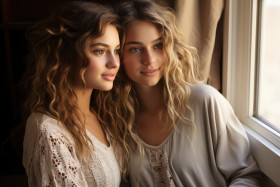 sisters communication sunlight family home bond togetherness intimacy secrets sweaters trust warmth candid love cozy comfort natural connection sharing confidences warmth indoors trust relationship lifestyle closeness affection hyperrealistic hdImagine Buddy