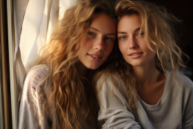 sisters communication sunlight family home bond togetherness intimacy secrets sweaters trust warmth candid love cozy comfort natural connection sharing confidences warmth indoors trust relationship lifestyle closeness affection hyperrealistic hdImagine Buddy