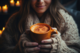 Woman enjoying a mug by the fireplace with a soothing glow on he