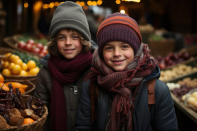Boys bundled up in cozy scarves explore a festive winter farmer