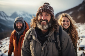 cozy bonding mountain outdoors hygge friendship snow trekking activity peaks cold exploration friends nature snow serenity hike tranquility adventure wilderness winter covered hyperrealistic hdImagine Buddy