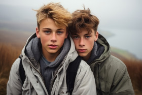 Boys in warm jackets enjoy a misty lakeside morning retreat, hyg