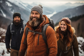 Friends exploring snow capped peaks, hygge concept
