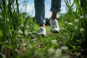 simplicity natural barefoot walking connection nature rejuvenation grass pleasure green grounding peaceful tranquility wellness serenity lifestyle enjoyment barefoot meadows freedom bliss freshness relaxation simplicity feet mindfulness leisure joy comfort sensory experience outdoors mindfulness summer carefree escape hyperrealistic hdImagine Buddy