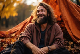 A man savors the season with warm comfort food and falling leave