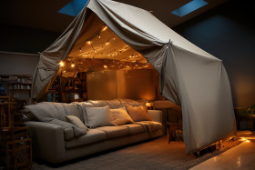 childhood nostalgia joy security cozy warmth comfort imagination play memories indoor home happiness relaxation construction creative playtime innocence safety retreat hideaway magical snug bonding family siblings homey tranquil retreat hyperrealistic hdImagine Buddy