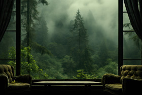Tranquil home ambiance with a view of a fog draped woodland through the window