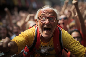 race runner senior elderly competition cheering crowd determination perseverance sportsmanship athleticism victory triumph motivation inspiration success achievement goal finish line hero champion celebration applause energy excitement flags banners spectacle drama intensity emotion passion teamwork unity community spirit active healthy lifestyle runner race race banner hyperrealistic hdImagine Buddy