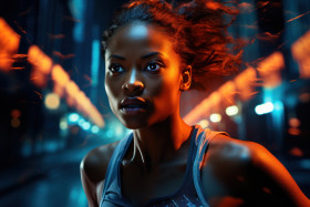 A female runner sprints across a bridge with dynamic city lights