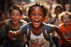 Little runner surrounded by faces beaming with excitement and pr