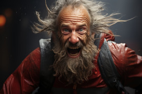 Old man runner embraces challenge amidst dancing water droplets,