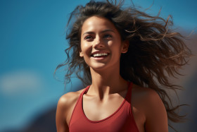 Smiling female runner embraces the joy of racing midway, runner
