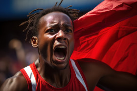 release race bib joyful accomplishment victory symbolic release runner breaking race emotional celebratory achievement success triumph celebration athletic race runner moment milestone achievement tension triumph gesture athletic bib tear racing symbolic joy tear through racing symbolism day victory runner race race banner hyperrealistic hdImagine Buddy