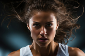 Female runner in a blur of motion against a sharp background, ru