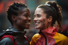 victory running finish line connection running line support moment emotional bonds together line embrace triumph finish connection embrace shared female victory runners' athletes emotional running sisterhood in finish community day finish community sisters connection triumph emotional post-race runners support race victory united community female runner race race banner hyperrealistic hdImagine Buddy