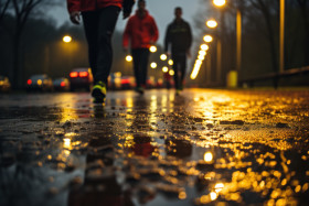 Runners concentration contrasted by reflective images in rainwat