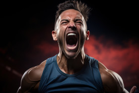 Fists clenched male runner roars across the finish line, runner