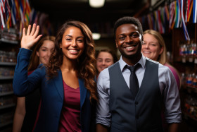 team camera celebration connection screen dedication remote recognition colleagues teamwork awards hyperrealistic collaboration victory high fives day hd gleaming joy technology medals digital achievement camaraderie online success accomplishment appreciation triumph employee honorImagine Buddy